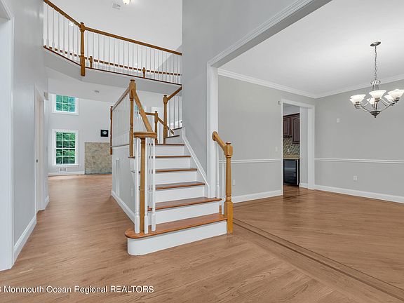 Walk into foyer from country style covered front porch to two sided quarter turn staircase with formal living and dining room on either side. The first floor has an oversize bedroom with a private full bath. Family room has 16 ft. ceilings and a wall of windows for plenty of natural light. The kitchen has a breakfast bar, granite counters, SS appliances, double sink, oversized walk-in pantry, mini-bar beverage cooler and wine refrigerator. Sliders lead to private backyard with in-ground pool. First floor laundry. Second floor features a spectacular primary bedroom suite with a sitting area, trey ceiling, recessed lighting, oversized bathroom with his/hers granite top vanity, Jacuzzi tub and two oversized walk-in closets. 3 additional bedrooms, Jack and Jill bathroom with full size-size bath and fourth bedroom with ensuite full bath finish the second floor.