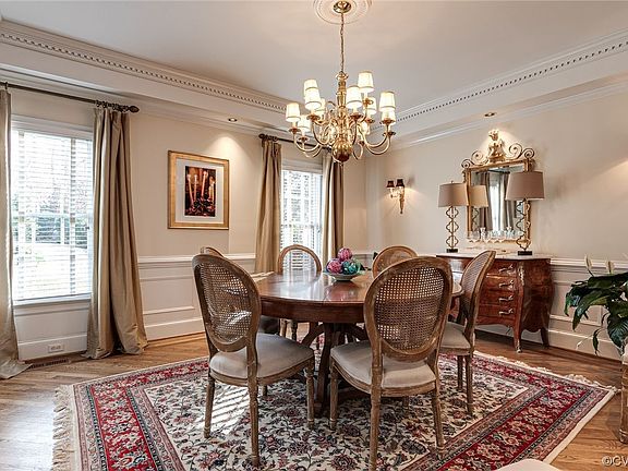 Discover the epitome of refined living at 9900 Carrington Pl - a splendid brick colonial in the sought-after Riverlake Colony. With 5,441sqft of luxury, this meticulously maintained home seamlessly blends timeless elegance with modern comfort. The bright foyer welcomes you with exquisite moldings, leading to the living room with a cozy wood-burning fireplace. Adjacent, the dining room boasts a tray ceiling, picture and dentil molding, and inlay hardwood floors, setting the tone for tasteful details throughout. The open floor plan connects the large family room, featuring another gas fireplace, to the updated kitchen, a culinary masterpiece with marble countertops, wood cabinets, and top-of-the-line stainless steel appliances, including a Wolf stove and microwave. The dry bar with a beverage fridge adds sophistication, perfect for entertaining guests or quiet evenings at home. The California Closet laundry room/pantry off the kitchen ensures ample storage, keeping your kitchen organized. Sunlight floods the bright sunroom with walls of windows, offering a serene view of the rear fenced yard. Upstairs, retreat to the primary bedroom sanctuary, with a beautifully updated ensuite bathroom boasting a spacious shower, soaking tub, heated floors, heated towel rack and a new double vanity with quartz counters. The California walk-in closet offers customized storage solutions and laundry chute directly to laundry room, making everyday routines a breeze. The third-floor bedroom, ideal for an au pair suite or extra bedroom suite, provides versatility and privacy. The walkout basement offers endless possibilities, featuring a media room with wood burning fireplace, full bath, bedroom/office, and access to the rear fenced yard, perfect for outdoor gatherings and play. Garage in the basement and beautifully maintained grounds add to the property's luxury and comfort. Conveniently located on the River Road Corridor, this home offers tranquility and accessibility. Don't miss the chance to call this Henrico gem home.