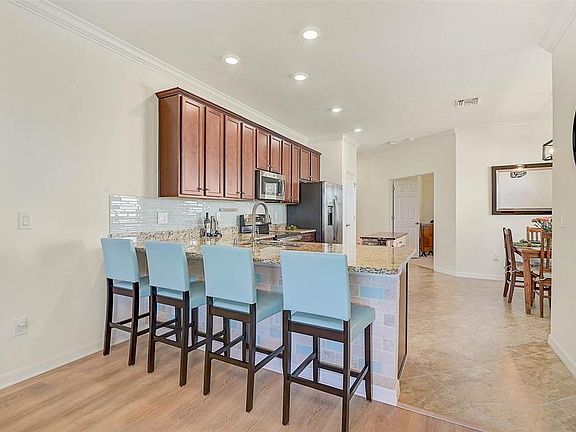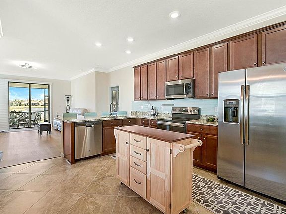 This beautifully maintained three-bedroom, two-bath Dahlia model villa, built in 2019, is located in the gated and highly sought-after Watercrest community. Designed for comfort and peace of mind, it features Storm Smart hurricane-rated lanai shutters, a peaceful lake view, and an oversized lanai perfect for relaxing or entertaining accessible from both living and primary bedroom. Inside, enjoy over 1,500 square feet of elegant living space with luxury plank flooring, crown molding, and plantation shutters throughout. The chef-inspired kitchen includes stainless steel appliances, granite countertops, a glass tile backsplash, and ample cabinet space. The primary suite features serene water views with direct lanai access, and an ensuite bath with dual vanities and a spacious walk-in shower. Additional highlights include a paver driveway, concrete tile roof, large laundry room with sink, and a two-car garage. With low HOA fees, no CDD, and a maintenance-free lifestyle, residents also enjoy resort-style amenities including a heated zero-entry pool, fitness center, bocce ball courts, and cabana—just minutes from Venice beaches and historic Venice Island.