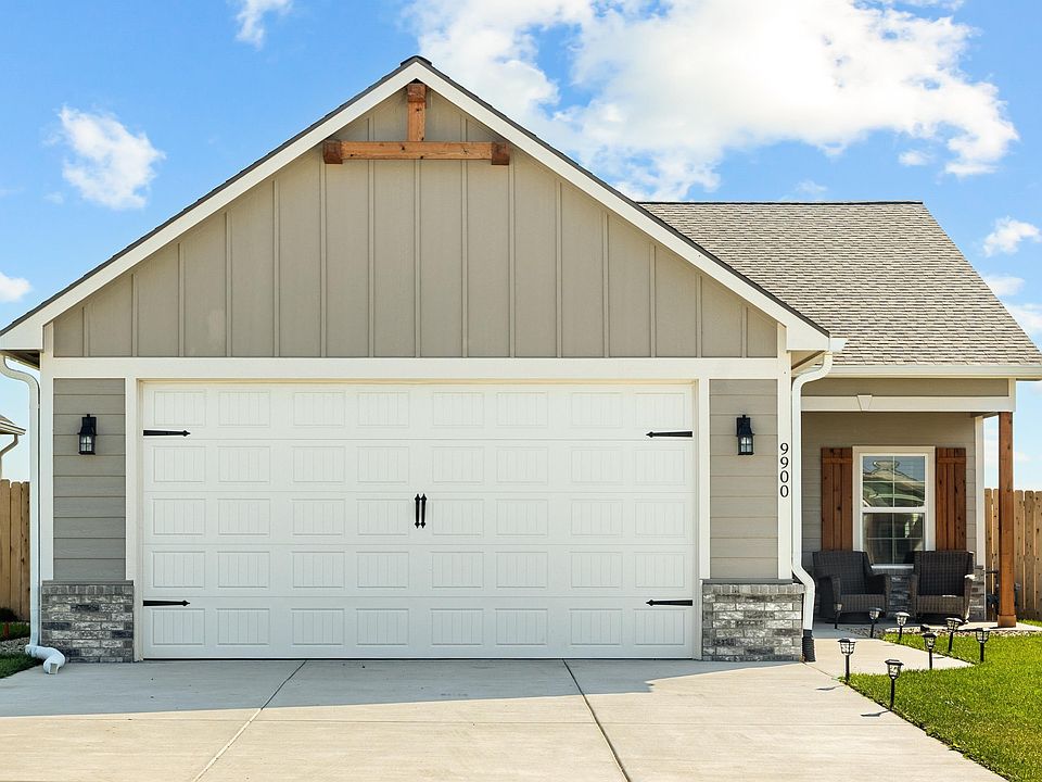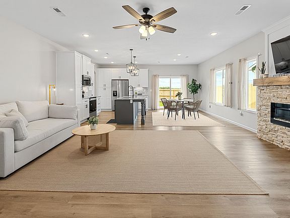 Better than new—immaculate 2025 construction, truly move-in ready. This bright 3-bed, 2-bath, 2-car home showcases custom details and an open layout. Living room features a stacked-stone electric fireplace and wainscoting. Kitchen offers abundant soft-close cabinetry, granite countertops, pantry, and a large island with seating, flowing to a sun-filled dining area and covered patio. Pocket office with barn door, butcher-block desk, and shiplap. Durable LVP in main spaces. Private primary suite with concrete safe-room walk-in closet, tiled shower, double vanities, and linen storage. Two additional bedrooms include custom closets with shelving and triple hanging. Outdoors: welcoming front porch, fully sodded fenced yard, irrigation. Lightly lived in since June; smoke-free, pet-free, impeccably maintained. Extras: Ring doorbell and high-speed internet ready, custom window treatments, washer & dryer, and kitchen appliances—all under manufacturer warranty.