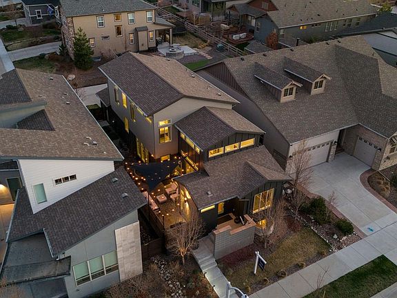 Outdoor living is redefined with a meticulously landscaped yard, offering a tranquil oasis. Though the space features a removable triangular shade, providing seasonal comfort, it’s an idyllic setting for al fresco dining or enjoying Colorado’s sunshine. The oversized 2-car garage, with extra overhead storage and built-ins, adds to the home’s appeal.