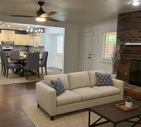 Inside, you’ll find two large living areas, a formal dining room, and an open-concept kitchen with granite countertops, new marble backsplash, and stainless steel appliances, including a refrigerator that stays. The main living room features a cozy wood-burning/gas fireplace, perfect for relaxing or entertaining.