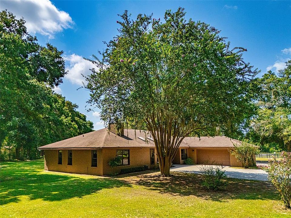 One Owner Home, CLEAN, First time on market. This Custom home was solidly built with Block and a Brick veneer. Featuring a 3 bedroom split plan and 3 Bathrooms (one is in the barn). The living room is spacious and bright with a Beautiful Wood Beamed Vaulted Ceiling , Skylights and a Transom Window. It Features a Wood Burning 2 sided Fireplace built with Stunning River Rock. The Primary Bedroom suite is large (17X21) and has a Fireplace. There is a Formal Dining room suitable for those Holiday Dinners while there is Casual Dining off the kitchen. Relax in the Huge Covered & Screened Lanai overlooking the back of the farm. Surround Sound will keep the party going. The Well Built Concrete Block center aisle barn has 4 (12X12) Stalls with big windows. Keep your Tack in good shape in the Central Air conditioned Tack room, there is also a Feed Room and a Loft for storage. Attached and at the end of the barn is a workshop that could be a fabulous Barn Apt.once renovated. Perfect Airbn. It already has Central Air Conditioning & a Full bath. The majority of the 5.65 Acres is in Pasture while there is a small forest with a walking path as well. This well thought out farm also includes a Detached equipment Garage in addition to the main house garage. This property is very private with its own Gated entry as well the main entrance gate. "Countryside Farms" is an Equine Friendly subdivision located a short 15 minute drive to the World Equestrian Center. This is the last Equine Friendly Gated Community right in town. Literally 5 minutes from Shopping, Dining, Hospitals and all the amenities the city has to offer, YET tucked away behind a Double gated entry. It is typical to see walkers and bike riding with the Homes showing Pride of Ownership . This community offers the Peace and Quiet you are looking for. No Lease restrictions. Would be a perfect Airbnb. Home owners association is healthy . The roads were recently paved. Fees are only $1000 annually. NO Flood Zone on this property.