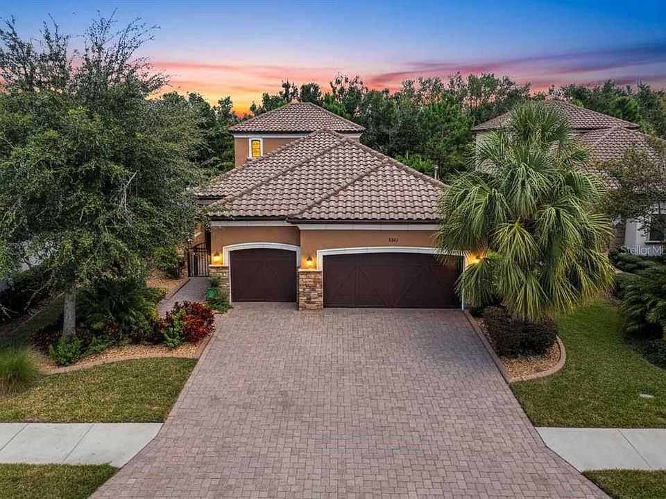 Welcome to this stunning Trevi floor plan pool home, located in Artisan Lakes Esplanade. This beautifully maintained, move-in ready residence offers 2,824 square feet of thoughtfully designed living space with an open concept layout that seamlessly blends comfort and style. The spacious main living area flows effortlessly into a perfectly crafted outdoor retreat, featuring a newer luxury pool enclosed in a screened lanai—an ideal space for relaxing or entertaining. One of the standout features of this home is the rare and highly sought-after extended 3-car garage, offering an additional four feet of depth for added storage, workspace, or oversized vehicles. The home includes 3 bedrooms, 3.5 bathrooms, a den, and a large bonus room upstairs, offering plenty of flexibility for modern living. The primary suite and a second bedroom are conveniently located on the main floor, providing both privacy and accessibility, while the third bedroom, full bathroom, and bonus living area are tucked away upstairs—perfect for guests, extended family, or an in-law suite setup. The third bedroom also features its own en-suite bath setup and extra privacy, making it ideal for multi-generational living or a private workspace. Inside, elegant architectural touches such as tray ceilings, crown molding, and arched openings add charm and sophistication, while the upgraded kitchen cabinetry enhances both style and function. Speaker wiring has been roughed-in for both the main living area and lanai, offering options for future audio upgrades. The home has been recently painted inside and out, and the HVAC system was replaced in 2021 with a high-efficiency unit for long-term comfort. The backyard is a true retreat, featuring low-maintenance artificial turf, concrete edging, and a unique fenced area—perfect for pets or a play space—all set against the peaceful backdrop of a private conservation area. The home features a luxurious saltwater, heated pool with a travertine deck, offering year-round enjoyment and a touch of timeless elegance. There’s also additional conservation across the street, enhancing the tranquil setting. From the picturesque courtyard entry to the mature landscaping that surrounds the property, every detail has been thoughtfully designed to create a welcoming and luxurious living experience. This original-owner home combines exceptional design, rare features, and an unbeatable location. Esplanade at Artisan Lakes offers resort-style amenities and is ideally situated near I-75, I-275, and US-41, providing quick access to shopping, dining, entertainment, and the beautiful Gulf Coast beaches.