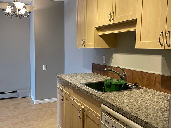 Renovated bachelor suiteLarge windowsGreat layoutGalley kitchenBlack appliancesUpdated cabinetsGlass tile backsplash
