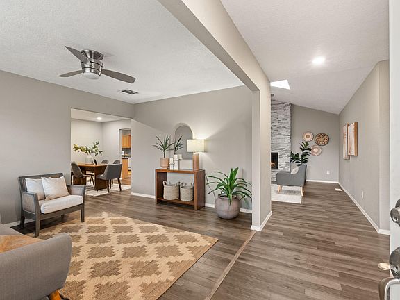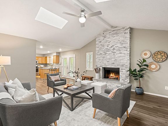 Welcome to this sleek, modern single-family home that embodies style, comfort, and modern design. Nestled in a desirable neighborhood, this residence offers an open-concept layout, high-end finishes, and an abundance of natural light, making it the perfect place for contemporary living. The expansive living area features clean lines, large windows, and laminate floors, creating a bright and inviting atmosphere. A stacked stone fireplace adds warmth and ambiance to the space, perfect for both relaxing and entertaining. The kitchen is a chef's dream, equipped with stainless steel appliances, sleek corian countertops, and a generous peninsula island with bar seating. Adjacent to the kitchen, the dining area offers a perfect spot for family meals or hosting guests. The primary suite is