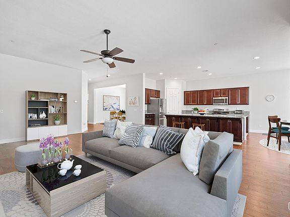 Welcome to the highly sought-after Four Seasons 55+ community, where every day feels like a getaway. Enjoy access to a resort-inspired clubhouse, spa, fitness center, tennis courts, scenic walking trails, an on-site salon, and an ever-changing calendar of social clubs and activities. This meticulously maintained 2B/2.5B home plus office spans 2,461 sq. ft. and showcases a thoughtful split-wing design, offering both privacy and seamless flow for entertaining or quiet retreat. The open concept layout is enhanced by warm wood-look flooring, a formal dining rm, and a chef's kitchen with granite countertops, bar seating, and generous cabinet space. The primary suite features dual vanities, a soaking tub, separate shower & walk-in closet designed for comfort and convenience. Additional highlights include a tankless water heater, oversized garage with room for storage or a golf cart, and a spacious backyard ready to be transformed into your personal outdoor oasis.