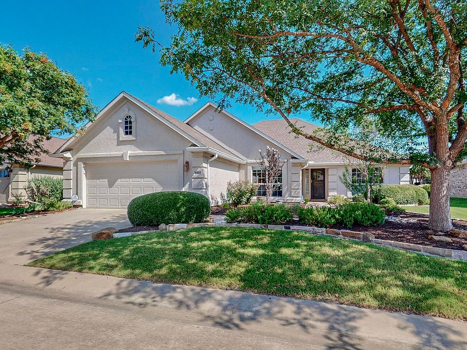 Move in ready Palmera home, perfectly situated on a serene greenbelt walking path with extensive landscaping. Step inside to find brand-new carpet, luxury vinyl plank flooring, and ceramic tile. The kitchen boasts granite countertops, white cabinets, an island with storage and seating, and an eat-in dining area. The living room features a gas fireplace framed by lighted built-in shelving, perfect for relaxing or entertaining. Retreat to the master suite, where you'll find a bay window, tray ceiling, a transom window in the bathroom, and a walk-in closet. The office is both functional and stylish, with French doors and a desk nook. The extended garage offers extra space and a handy service door. The enclosed four-season patio is a true highlight, featuring wood-look tile, ceiling fans, and its own heating and cooling, allowing you to enjoy this space year-round. This home is a perfect blend of comfort and elegance, ready for you to make it your own.