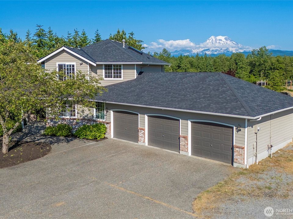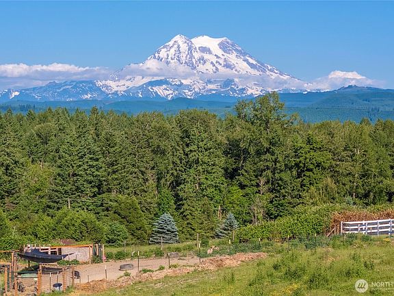 Welcome home to East facing breathtaking 180 degree views of Mt. Rainier. Enjoying modern luxuries all the while from this 2.5+ acre estate. This spacious home features updated kitchen| granite counter tops| new LVP and paint on the main floor |beautiful primary bedroom & spa like bathroom |updated bathrooms| newer furnace| SS appliances| 3 bedrooms +den or 4th bedroom| 3-car garage w/ tons of storage| 10ft. high ceilings| RV parking |fully fenced pastures| skylights & an abundance of natural light w/ windows spanning the downstairs living area. Home is tucked away on a private street with only 4 homes.** CLICK the VIDEO TOUR** Nearby NW Trek, lakes, hiking, Mt. Rainier & horseback trails.