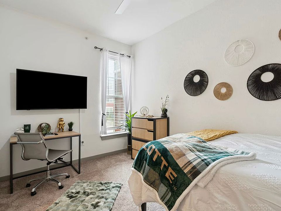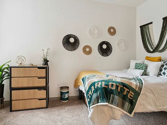 Move in as early as late December or early January into a fully furnished, private bedroom and private bathroom in a spacious 4x4 unit at The Drake, one of the most convenient student housing options near UNC Charlotte.