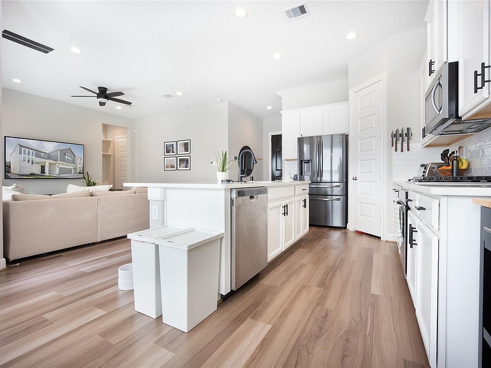 Stainless steel appliancesSpacious walk-in closetsAbundant natural lightingNeutral paint colorKitchen with large islandWhite cabinets