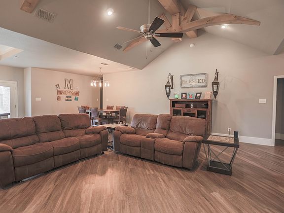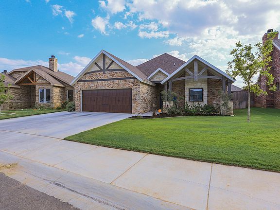 This beautiful 3/2/2 home is located in Lubbock Cooper school district. You will love all the extras in this 2016 Parade Home. It has open concept living, dining and kitchen with vinyl plank flooring throughout. The living area has a gorgeous stone fireplace with vaulted ceiling with special effects. The kitchen has beautiful granite countertops, a large island (with a concrete countertop), farmhouse sink, GE appliances with slate finish and a gas range. The master bedroom is spacious, with coffered ceiling and accent wall, and master bath has his and her sinks, vanity, soaker tub, walkthrough shower, and large walk-in closet. The wrap around covered patio features a grilling suite, fan, sound system, and TV hookups. Don't miss out on this amazing home located in a friendly neighborhood in South Lubbock, close to shopping and restaurants!