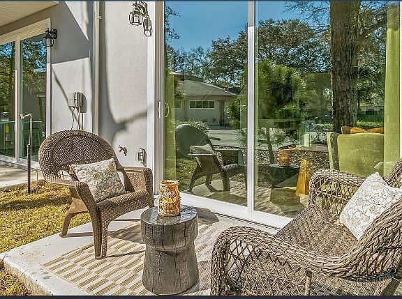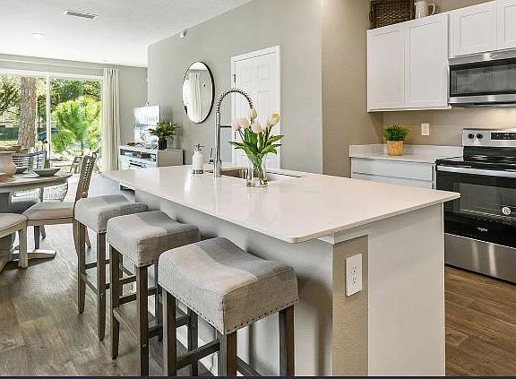 Large islandModern designPrivate patioHigh ceilingsSleek quartz countertopsOpen-concept floor planNatural light