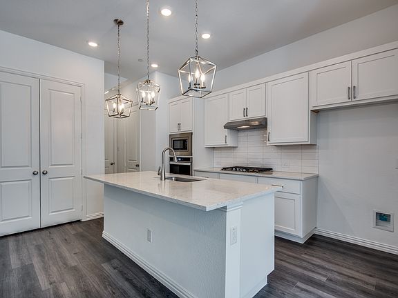 The open-concept layout features upscale finishes including Energy Star-rated Whirlpool stainless steel appliances, Maestro Quartz countertops, a sleek under-mount single-bowl sink, gas cooktop, built-in oven and microwave, 42-inch cabinets, a ceramic tile backsplash, Moen faucet, and pendant lighting over a spacious island with an eat-in bar.