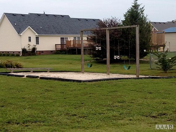 Lovely 3bd/2 bath home in a waterfront community in Weeksville. House has been very well kept and has lots of special features including laminate floors throughout, custom fit wood blinds, gas powered on-demand hot water heater, and generator plug in garage, garage floor has been painted and sealed, view of the river from the back deck painted with Olympia Outdoor, and there is a swing set out back. Exterior was recently pressure washed and front door has been freshly painted. Kitchen w/ bar and dining area open to living room with gas logs.
