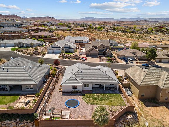 Step outside to a generously sized yard with mature fruit trees including peach, cherry, fig, and pomegranate, along with grapevines and a trellis. The side yard features raised planter boxes and an irrigation system perfect for gardening enthusiasts. The north facing back covered patio is ideal for relaxing or entertaining while taking in panoramic views of the valley and Pine Valley Mountain.
