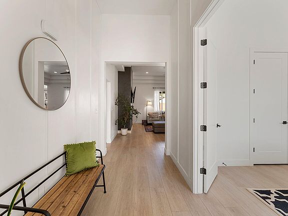 Elevated ceilings 11 feet in the entry, front of house, living room and 9 feet elsewhere creating a spacious, open feel. The main living area features a floor-to-ceiling Roman plaster fireplace, accent walls, and a large kitchen and dining space that flows naturally to the backyard.