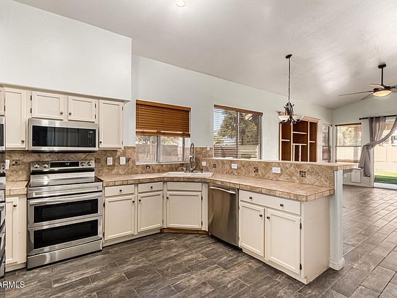 Fenced poolCovered patioLarge pie-shaped lotTons of natural lightTravertine tile backsplashTile countersAmple cabinetry