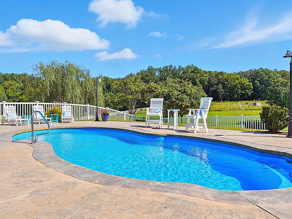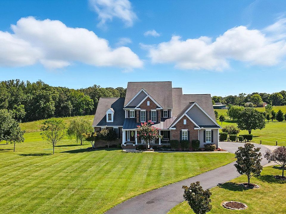 Welcome to Bloomsbury Farm Estates, where timeless design meets modern comfort. This 5-bedroom, 6.5-bath estate offers over 6,530 finished square feet on 5.72 private acres, complete with a 3-car garage, TWO Primary Suites, finished walkout basement, and heated saltwater pool surrounded by views of rolling hills and farmland. The magnolia-lined asphalt driveway leads to the home’s inviting covered front porch. Step inside the foyer and you’ll find wide-plank hardwood flooring, extensive oversized trim, and custom plantation shutters throughout, setting the tone for the home’s craftsmanship. French doors open to the bright living room with a coffered ceiling, columns, and a gas fireplace with custom built-ins, overlooking the gourmet kitchen. The formal dining room (currently used as a home office) is designed for effortless entertaining, opening directly to a butler’s pantry complete with custom cabinetry and sink—a seamless connection between kitchen and dining spaces that adds both function and elegance. The heart of the home is the gourmet kitchen, anchored by a striking wood coffered ceiling that adds warmth, depth, and architectural character. The kitchen is outfitted with stainless appliances including GE dual ovens, a gas range, a Samsung refrigerator, dishwasher, dual pantries, and a large center island with seating. Just off the kitchen, the family room offers a cozy retreat with plush carpeting, custom built-ins, and a gas fireplace, creating a warm and inviting space for everyday living. The home extends outdoors with a screened porch featuring Trex flooring and a ceiling fan, overlooking the sparkling pool. Accessible directly from the living room, it’s the perfect spot to relax and take in views of the property. For added convenience, a half bath is situated in the main hallway for visiting guests. The main-level laundry room is both stylish and functional, featuring a deep utility sink, custom wood cabinetry with soft-close doors, and a convenient drying rack. Designed with organization in mind, this space makes everyday tasks easier while maintaining the home’s elegant design aesthetic. This home offers the rare luxury of two primary suites, one on the main level for convenient first floor living and another on the second level. The main-level primary suite is a retreat of its own, with a tray ceiling, walk-in closet with custom built-ins, and spa-like bath featuring dual vanities, a soaking tub framed by an etched glass window, water closet, and a tiled walk-in shower. Upstairs, the second-level primary suite showcases tray ceilings, a ceiling fan, and plush carpeting, along with a walk-in closet with custom built-ins. The spacious bath includes tile flooring, dual vanities, a soaking tub set beneath a large window, a private water closet, and a second walk-in closet with built-in shelving and automatic lighting—combining elegance with everyday functionality. Completing the second level are three bedrooms each with their own en-suite bath and closet. The spacious finished basement provides an additional level of living and entertaining space. A well-appointed kitchenette makes hosting gatherings effortless, while the expansive recreation room with oversized windows and walkout access to the patio and pool is ideal for movie nights, game tables, or casual entertaining. A dedicated gym—easily convertible into a sixth bedroom with a large walk-in closet—offers flexibility for fitness or guests, and a full bath with tile finishes ensures comfort and convenience. In addition to its expansive finished spaces, the basement also includes an unfinished area ideal for storage, keeping seasonal items, recreational gear, or household essentials neatly tucked away without sacrificing living space. Outdoors, enjoy the heated 6-foot-deep saltwater pool, enhanced by vinyl fencing, a paver patio, and stamped concrete surround—an entertainer’s dream and a true extension of the home’s living space.