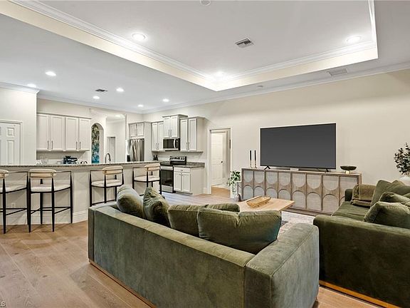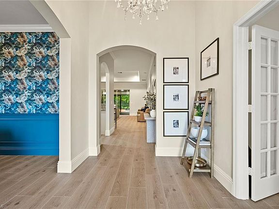 Immaculate property located in desirable neighborhood, The Forum. It is everything you've been looking for; This 4 bed 2 bath home is nestled on an oversized corner lot in the gated community of Promenade East. Over 2,300 sqft of completely renovated interior with designer finishes. Beautiful porcelain wood-plank tile runs throughout the home with 7 inch baseboards to compliment the look. This home provides a split bedroom floor plan with tray ceilings, crown molding and built-ins. Step into the luxurious open-concept kitchen that offers new stainless steel appliances, a beautifully redone formal dining room featuring premium wallpaper and decorative wainscoting. Bathrooms have been completely renovated with imported exotic Italian marble, new marble top vanities, premium wallpaper and oversized soaking tubs. The home's AC unit has been replaced and new as of 5/2024. The exterior presents a spectacular 1,000 SQFT CUSTOM LANAI featuring all ceramic wood style floor, custom aluminum window enclosures and separate A/C unit for the comfort of inside/outside living. In addition, there is a brick paved patio for outside enjoyment and a private basketball court. The backyard is completely surrounded by areca palms making this a private oasis, perfect for outdoor living and entertainment! Walking distance to target, Starbucks, shopping, dining, banks and more! Just minutes away from i75, ECS High School and US41. Move-in ready, this property awaits it's new owner! LOW HOA and NO CDD.