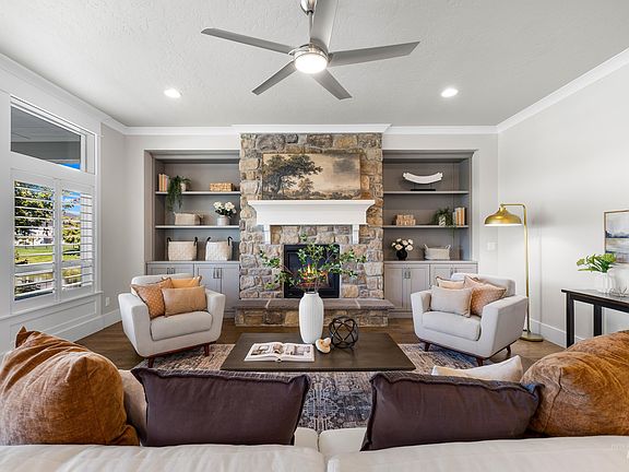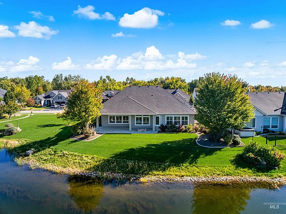 Elevated waterfront living awaits in this thoughtfully designed community, where unbeatable amenities include a resort-style pool, clubhouse w/gym, basketball/tennis/pickleball courts, and a playground. Idyllic pond views frame this quality-built James Clyde home, showcasing custom upgrades and refined design throughout. Impressive interior highlights 1" thick white oak hardwoods, 10' ceilings, detailed millwork, and high-end Pottery Barn lighting. Light-filled great room centers around a striking stone fireplace and walls of windows overlook the serene backyard oasis. A magazine-worthy chef’s kitchen features top-tier Thermador appliances, quartzite countertops, roll-out cookware drawers, and a walk-in pantry with built-in appliance shelving — blending beauty and functionality. Main-level master is a private retreat, complete with a spa-inspired ensuite offering a soaking tub, dual vanities, and walk-in tile shower. Upstairs, a versatile bonus room, oversized bedroom, and full bath provide the ideal space for guests or multi-gen living. End your day beneath the covered patio with natural gas hookup or gather around the built-in fire pit with soothing water views as your backdrop. A fully insulated 4 car garage with epoxy flooring completes this exceptional home located minutes from scenic trails, city parks, Boise River, and Star Ponds — with fishing access right out your backyard!