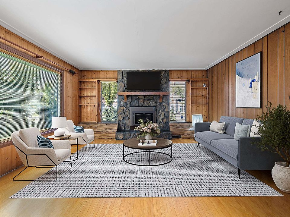 Vintage light fixturesOriginal wall panelsStone surround fireplaceVinyl floor in kitchenNew carpets in bedroomsMany treesOversized detached garage