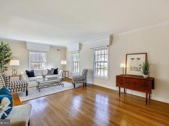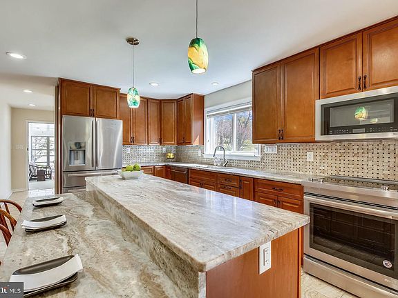 Meticulously maintained 6 bedroom, 3.5 bath Colonial with nearly a half-acre of professionally landscaped and maintained space to enjoy, backing up to Bethesda Country Club in handsome Ashleigh. Welcome to the home's impressive and recently renovated three-level layout. The home was thoroughly renovated in 2018. The main level showcases the home's exquisite workmanship with a beautiful hardwood staircase, refinished hardwood floors, built in corner cabinets, window valances, paneled den with brick fireplace, along with fine crown molding, wainscoting, and chair rail throughout. The kitchen is a chef's dream with a generous layout, featuring Jenn-Aire appliances (microwave, range and oven, dishwasher, refrigerator/freezer), a tile backsplash, a pantry, and ample granite center island counter space for prep and island for buffet serving. Transition easily to the formal dining room or the sun porch with exposed brick. Retire to the peaceful primary suite with hardwood floors, a custom walk-in closet and sitting room, laundry with LG Washer and Dryer, and an en suite bath granite vanity and glass waterfall shower. Three additional bedrooms with hardwood flooring and abundant closets, a full bath with high end finishes, large closets, and an attic. The finished lower level is filled with great bonus space, two large bedrooms that could be used as offices, full bath, auxiliary kitchenette, storage room, and walk-out to the fenced yard and patio. Head outside to the treed yard overlooking the golf course. The large two-car front loading garage was completely refinished and furnished with professional cabinet organizers, and has driveway space for four more cars. The The A/C was replaced and the furnace was replaced in 2016 with a Lennox natural gas furnace with Aprilaire humidifier. There is a new 2022 State water heater. The home's location is perfect for errands, work, and play. Nearby are a pool and tennis club, walking trails, and an ice rink in Cabin John Regional Park. Easy access to I-270 and I-495 and commuting options and to Westfield Mall, Potomac Village, Cabin John Village, and Bethesda or downtown.