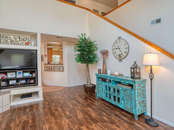 Stunning two-story home tucked in the desirable Quintessence neighborhood, close to parks, trails, and top-rated schools. Convenient main level private primary suite, AC, & fresh flooring throughout - including beautiful kitchen tile, updated carpet, and stylish wood-look tile. The kitchen features granite countertops & stainless steel appliances, while a cozy gas log fireplace and cathedral ceilings create a warm and inviting living space. A whole-home humidifier has also been added to the HVAC system for extra comfort. Upstairs, enjoy breathtaking views of the Sandias at sunset or the Tanoan golf course from your private balcony. Two loft spaces provide flexibility for play or work- one could even be converted to a 4th bedroom. Beautifully landscaped backyard, covered patio and hot tub!