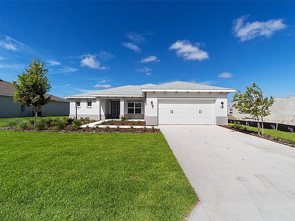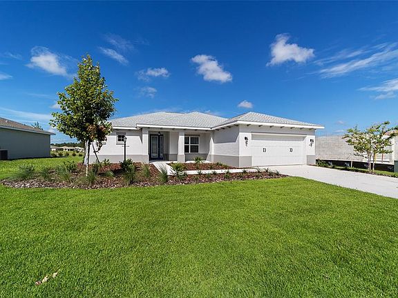Welcome to the Livingston Model, a beautifully crafted new construction home located in LongLeaf Ridge at On Top of the World, Ocala’s premier 55+ active adult community. This thoughtfully designed home offers 2 bedrooms, 2 bathrooms, an oversized 2-car garage with golf cart parking, and a versatile open flex space perfect for a home office or hobby area. At the heart of the home, the gourmet kitchen features stainless steel appliances, premium white cabinetry with crown molding, quartz countertops, under-cabinet lighting, an elegant backsplash, a pantry, and a spacious island—ideal for both meal prep and entertaining. The dining area, highlighted by a chandelier and backyard views, flows seamlessly into the open living space. From the living area, a 3-panel sliding door opens to the screened lanai, creating a perfect indoor-outdoor lifestyle. The primary suite is a peaceful retreat with two windows overlooking the backyard, a walk-in closet, and a spa-like en suite complete with double vanity sinks, quartz counters, tiled flooring, and a zero-entry tiled shower with built-in bench. The guest bedroom is conveniently located near the full guest bathroom, which includes a single quartz vanity and a tiled tub/shower combination. With its elegant finishes, open design, and access to world-class amenities in a gated, golf cart-friendly community, the Livingston model offers the perfect blend of comfort and style. Schedule your private showing today and discover why so many choose to call On Top of the World home!