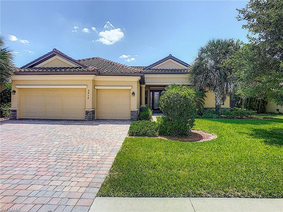 Beautiful 2,362 square feet, 4 bedrooms 2 and a half baths with a 3 car garage. Crown molding and tray ceilings and a beautiful kitchen featuring updated stainless appliances, granite counters, warm wood cabinets plus a pantry, over-sized double basin sink with eat in counter plus breakfast nook. In the wall and in the counter cooktop stove and oven. Closets are upgraded with shelves and drawers for maximum functionality. Spectacular upgraded master bath with dual sinks, garden tub and glass enclosed shower. Fenced in backyard. Deep colored granite counter tops in kitchen as well as both full bathrooms. Landscaped front, paver-clad driveway and "in the wall" pest control access. HOA fees includes the gated entrance, lawn maintenance, tree & shrub trimming, fertilization & pest control, and lawn/land maintenance. Master association fee includes, pest control exterior, security, street lights, and street maintenance.