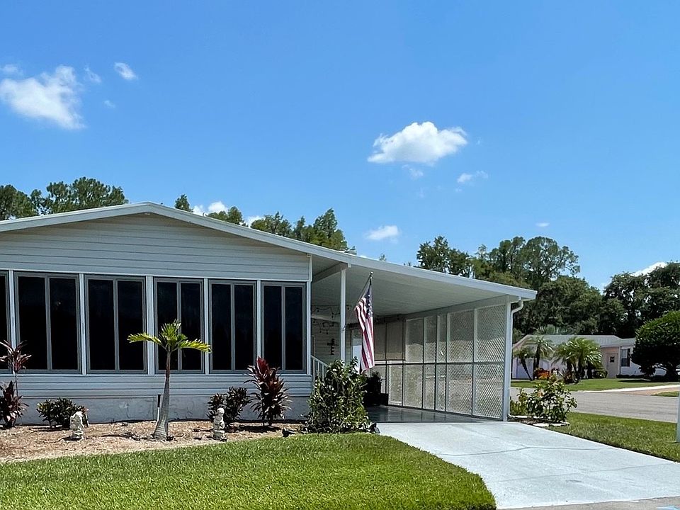 Listed by the Official Sales Team of Cypress Lakes Village ***This home is located within a 55+ resort style leased land community; age restrictions apply.*** A MUST SEE! Immaculate 'no project' 1991 Palm Harbor home offers 1128 SF with 2 bedrooms, 2 bathrooms, and a large 4 season room. The home has been fully renovated with warm color tones throughout. The full-length front facing 4 season room has Low E tinted acrylic sliding windows with shades, tile flooring, and is under AC and heat to provide lots of enjoyment. Updates to the home include new Thermopane windows, 2020 roof, 2024 AC, 2024 Hot Water Tank, LED lighting throughout the home, and the appliances are only a few years old. The primary bedroom suite allows plenty of room for a king set, a walk-in closet, and the ensuite offers a walk-in shower. The guest bedroom is roomy with a full-wall closet. Outside you will find both driveways have been epoxied as well as the walkway to the oversized golf cart shed. The oversized insulated shed houses the laundry area, a full workshop, and still room for the golf cart plus lots of storage! There is even a sitting area under the carport which still allows for 2 cars in the driveway. This home is being offered partially furnished with a golf cart. This home will not disappoint. Call now for your private tour! 3 MONTHS of FREE GOLF on both our Championship & Executive Courses included in sale. ***Listing details are provided by homeowner and are not guaranteed.***
