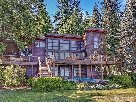 Experience coastal living at its finest in this stunning NW Contemporary on Johnson Point! Enjoy sweeping Puget Sound views with Harstine Island to the south, Longbranch to the north, and breathtaking sunsets over the Olympic Range through a wall of west-facing custom wood windows. Over 4,000 SF of living space with main-floor primary suite, gourmet kitchen, expansive great room, and 1,000 SF deck capable of hosting 50+ guests. Downstairs offers a large rec space, guest suite, ¾ bath, and direct access to the swim spa and patio. Detached oversized 2-car garage features a 600+ SF guest loft with its own ¾ bath—perfect for Airbnb/VRBO. Just 8 steps to a walkable beach with full Mt. Rainier view—this is true Northwest luxury!