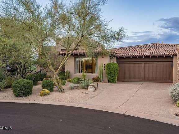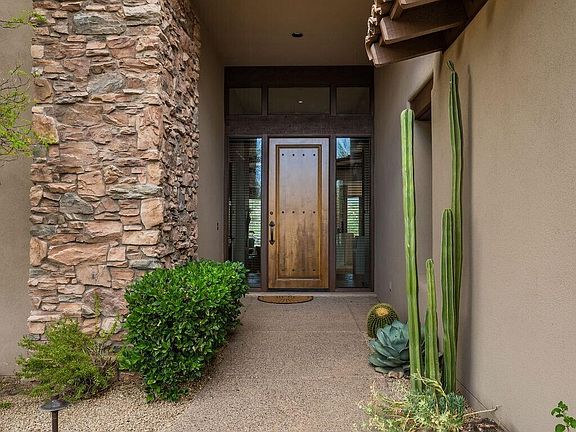Golf Membership Available- This delightful retreat—perfect as a full-time residence or effortless part-time lock-and-leave offers the quintessential blend of casual elegance and seamless indoor-outdoor living that defines Scottsdale's Desert Mountain lifestyle. Perched gracefully on a hillside cul-de-sac, this single-level Santa Fe-inspired residence showcases modern stucco and stacked stone accents while capturing sweeping views that stretch from the Northwest to the Eastern horizon. Majestic mountains, wide-open skies, and the striking desert landscape set a breathtaking backdrop for everyday living and entertaining. From the moment you step inside, the entry foyer elicits a ''wow'' with its immediate reveal of open, light-filled spaces. The split great room floor plan unfolds with walls of glass framing picturesque vistas. Beamed ceilings, a stately fireplace, a bar alcove, and direct patio access create a refined yet welcoming settingideal for festive gatherings or quiet evenings with close friends. The adjacent dining room, with its inset ceiling detail, modern chandelier, and patio connection, flows effortlessly into the chef's kitchen. Here, an expansive 8' x 4' island with seating, granite counters, abundant cabinetry, and high-end appliances invite both everyday enjoyment and culinary creativity. On the west wing, the private primary suite offers a spacious retreat with a cozy sitting area, fireplace, and expansive picture windows framing the desert beauty. Its spa-inspired bath features dual vanities (one with a dedicated make-up area), a generous walk-in shower, skylight, and a separate water closet. The substantial walk-in closet completes this luxurious suite. At the heart of the home, near the entry, an office or ensuite bedroom provides flexibility with double door entry, front-facing picture window, full closet, and a bath with tub/shower. On the east wing, a junior primary suite offers a tranquil haven with outdoor patio access, a sitting area, private bath, and walk-in closetperfect for hosting family or guests. Outdoor living is elevated with a wraparound patio designed to embrace Arizona's year-round sunshine and panoramic northern views. A raised spa commands attention at the center, while covered areas for lounging and dining, a built-in grill, and open sunning spaces invite endless hours of enjoyment. Throughout the home, polished flagstone floors flow seamlessly, complemented by plush carpeting in the great room and bedrooms. Granite and tile finishes, bronze fixtures, and thoughtful architectural details lend warmth and refinement. Perfectly located just minutes from the Sonoran Fitness Club and the Desert Mountain front gate, this home offers convenient access to Scottsdale's acclaimed dining, shopping, and cultural attractions, as well as Phoenix Sky Harbor International Airport. As a Desert Mountain member, you'll enjoy unparalleled amenities: seven world-class golf courses, seven luxury clubhouses, the award-winning Sonoran Fitness Center & Spa, and The Ranch with 20+ miles of pristine hiking trails bordering the Tonto National Forest. Embrace the Arizona dream with this exceptional Desert Mountain propertya refined yet relaxed residence offering both serenity and sophistication in one of Scottsdale's most coveted communities.