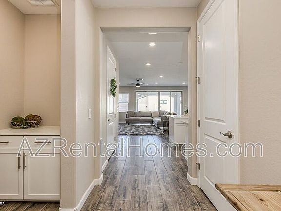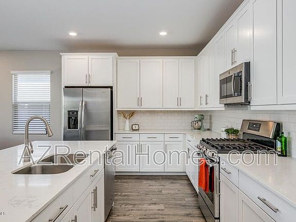 Stunning 2019 build available in the amenity filled Cadence Horizon community. This 3-bedroom 2 bathroom boasts luxury wood plank tile flooring throughout with carpet in the bedrooms. The kitchen has 42'' white shaker cabinets, crown molding, white quartz countertops, stainless steel appliances, and an oversized island with seating for four. The owner's suite includes a dual sink vanity, walk in shower and closet. The backyard is landscaped with an extended paver patio, low maintenance turf, granite and has a built-in fireplace. As a tenant you will have access the community amenities including tennis courts, heated pool/spa, waterslides, gym/fitness facility, game room, clubhouse, playgrounds, greenbelts, and basketball courts.