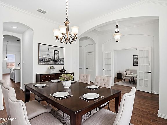 Beautifully maintained 3 bedrooms, 2.5 bath home with study and 2 dining areas located in the desirable Crown Ridge community and zoned to highly rated Prosper ISD. This home features an inviting open concept floor plan filled with natural light and a cozy gas fireplace in the family room, perfect for modern living. A private home office greets you off the entry opposite the formal dining room. The spacious kitchen offers a large island with breakfast bar, stainless steel appliances, gas cooktop, and plenty of cabinetry. A mud room is conveniently located next to the laundry room. There is no carpet. Luxury vinyl plank flooring extends throughout the entire home and there are numerous closets for ample storage. Relax or entertain outdoors in the large backyard with a covered patio, ideal for gatherings and family fun. Located just minutes from shopping, dining, and entertainment with easy access to major highways, this home blends comfort, style, and convenience. Residents enjoy community amenities including a park and pool. Prime Frisco location in Prosper ISD. This home has it all.