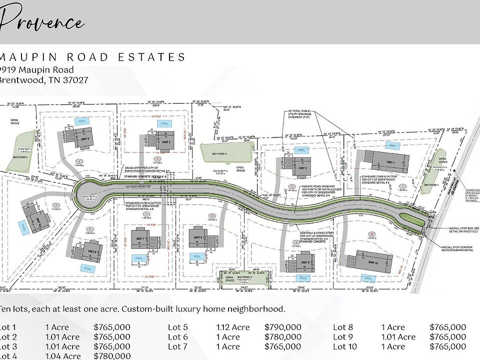 Provence offers ten spacious homesites in the hills of Brentwood, Tennessee. Lot 4 is on 1.04 acres. Each homesite spans a minimum of one full acre, providing privacy and space for luxury living. Build your custom home in one of Williamson County's most desirable locations. All lots have full access to Brentwood city water and sewer systems, eliminating well or septic concerns. The spacious lots allows you to design and construct your custom luxury home, accommodate luxury pools, outdoor entertaining areas and extensive landscaping. The community features private walking trails that wind through the natural landscape, a tranquil pond that serves as a peaceful focal point, and sidewalks that encourage connectivity throughout the neighborhood. With only ten homesites total, the development maintains exclusivity and privacy. This scenic community sits in the rolling hills of Williamson County, offering natural beauty while maintaining convenient access to Nashville. The location provides prime Brentwood positioning, proximity to shopping and dining, zoned access to Williamson County Schools, quick access to Nashville's business centers and mature trees with natural surroundings. These large-acreage lots in established Brentwood represent an exceptional lifestyle opportunity in one of Tennessee's most desirable communities. Currently, all 10 lots may be purchased together. Buyers will need to confirm their own site plan; this is for marketing purposes only.