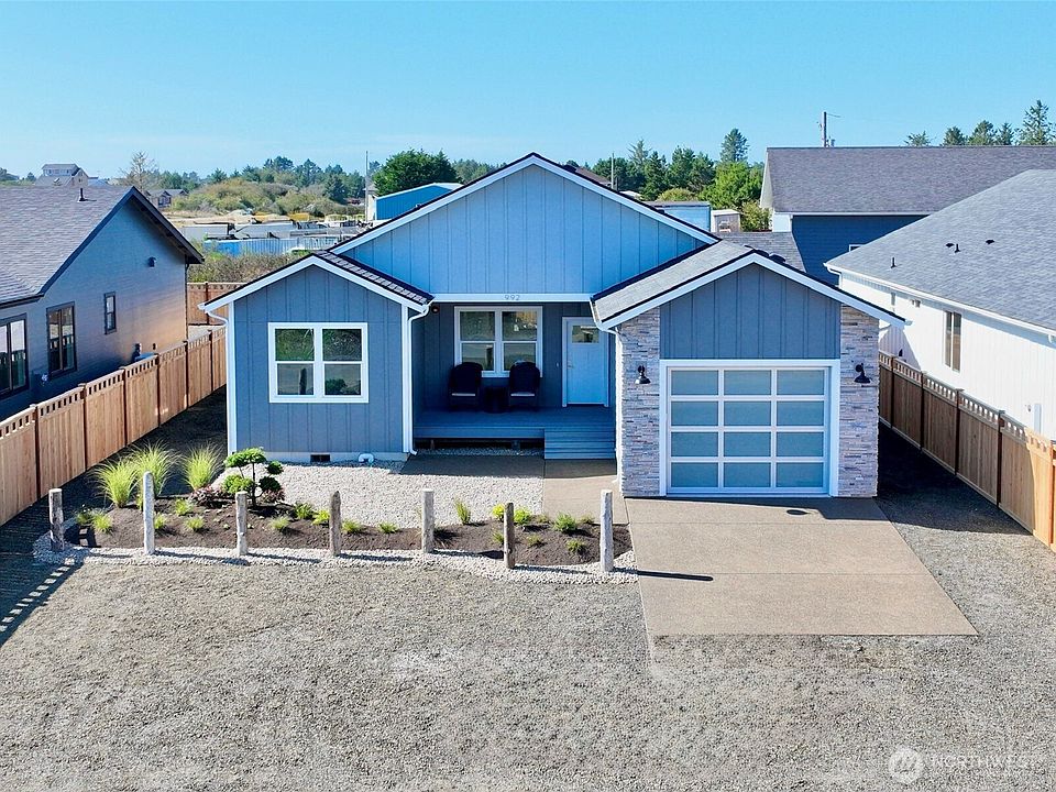 New Coastal Elegance at Ocean Shores, WA! LEGAL SHORT TERM RENTAL near beach access via Tonquin Ave or ship canal park. 1,365 sf residence features 2 BR 1.75 BA and a 1-car garage. Open concept great room with stack-stone fireplace flanked by built-in cabinets. 9' ceilings. Statement lighting. Spacious kitchen with 3cm Quartz slab countertops, stainless appliances, and an island with wine storage. Dining w/access to the back covered deck. Private primary ensuite with coffered ceiling, walk-in closet, door to deck, and bathroom with tiled shower. An additional sunny bedroom and full bathroom complete this plan. Mini-split AC/Heat. Plumbed for EV/RV. Wired for a hot tub. Hot/cold exterior spigot. Landscaped front. RV parking. 7,299 sf lot.