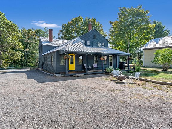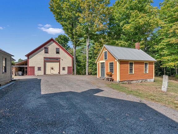 16 acres of forested land, the property is zoned village/commercial, offering both residential comfort and business potential. There are four distinct buildings: the main house with Colonial details like wide-plank pine floors, multiple fireplaces, and exposed beams; a small historic building once serving as the general store; and two large barns, including the livestock barn upgraded with an insulated floor, water, and 400 Amp service.