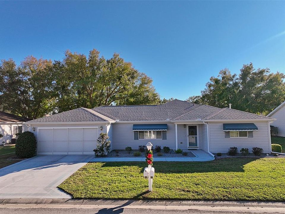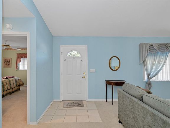 Palm II Model in the Del Webb Community. Lovely 2-bedroom, 2-bath home featuring a bright four-season tiled sunroom, perfect for relaxing or entertaining year-round. The spacious eat-in kitchen offers porcelain tile flooring, abundant cabinet space, and granite countertops. The living and dining rooms are comfortably carpeted, creating a warm and welcoming atmosphere. The master bedroom is also carpeted and includes two closets plus a linen closet. The en-suite bathroom features double sinks and a walk-in shower. A large inside laundry room adds convenience and extra storage.Additional features include Leaf Filter protection on the gutters and a patio with a birdcage enclosure, ideal for enjoying the outdoors with added comfort. Washer and Dryer are included. Air conditioner is 10 years old. Furniture is optional. 36 hole championship golf course just a short golf cart ride from home. Fitness center with pools, softball complex, shuffleboard, bocce ball and pickleball courts. Just minutes from the Villages