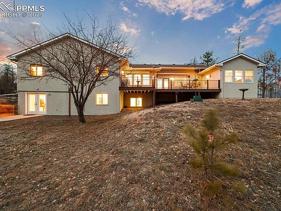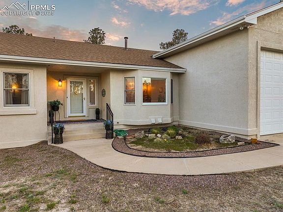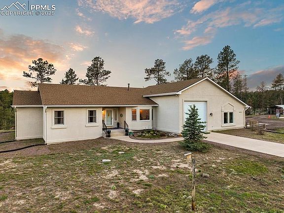 Immaculate 4BD/4BA ranch on 5.5 private acres in Black Forest! This meticulously maintained 3,528 sqft home features vaulted ceilings, hardwood floors throughout main level, and an open floor plan with formal dining room. Master suite includes access to sunroom with hot tub. Walkout basement with private entrance, wet bar, and additional bedroom—perfect for guests or potential rental. Expertly maintained boiler system with complete records provides efficient baseboard heating throughout the home, workshop, and garage. The extraordinary oversized garage offers generous ceiling height, epoxy floors, finished drywall, in-floor drains, and hot/cold water access. Attached workshop with heated floors. Dedicated RV garage plus separate RV hookup on property. New deck overlooking naturally landscaped, professionally fire-mitigated grounds with abundant wildlife and privacy. No HOA! Property served by well water. Ideally positioned for easy commuting to Colorado Springs and Castle Rock while enjoying the tranquility of Black Forest living. A rare opportunity to own a perfectly maintained property combining main-level living convenience, abundant natural light, and acreage in one of Colorado's most desirable areas.