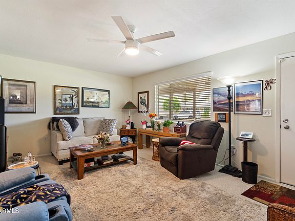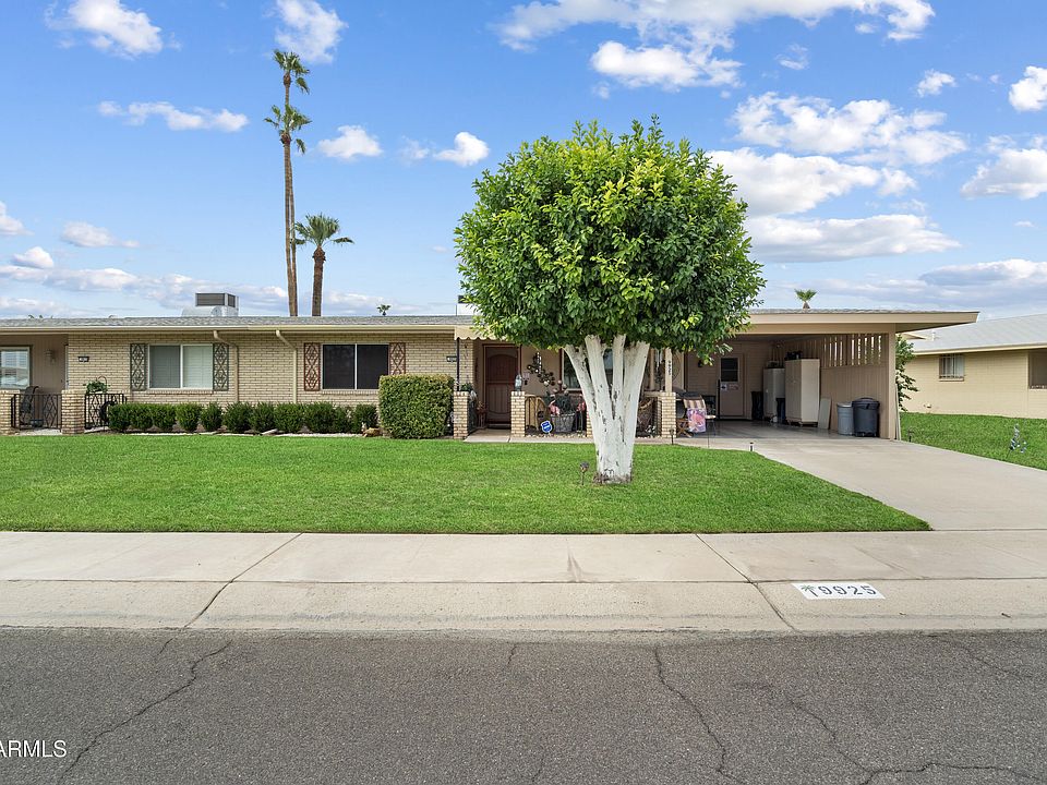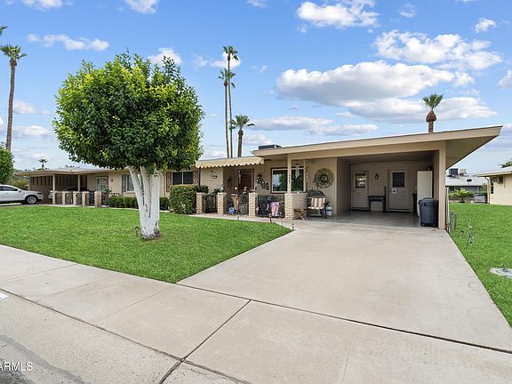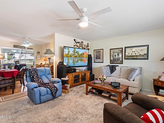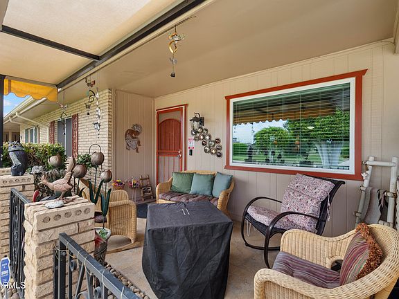 A fantastic opportunity to own a well-maintained home in the highly desirable Sun City. You will adore the well appointed features of this home. From the moment you walk to the front, you will be greeted by a private, fenced in porch/courtyard area. Step through the front door and you will love the spacious living room. A few steps away and you will enjoy the eat-in kitchen featuring an ample counter space, cabinetry and storage along with a peninsula island. Primary bedroom has a beautiful, updated ensuite. You can enjoy countless mornings in your beautiful Arizona room drinking freshly brewed Kona coffee. This home is a must see!