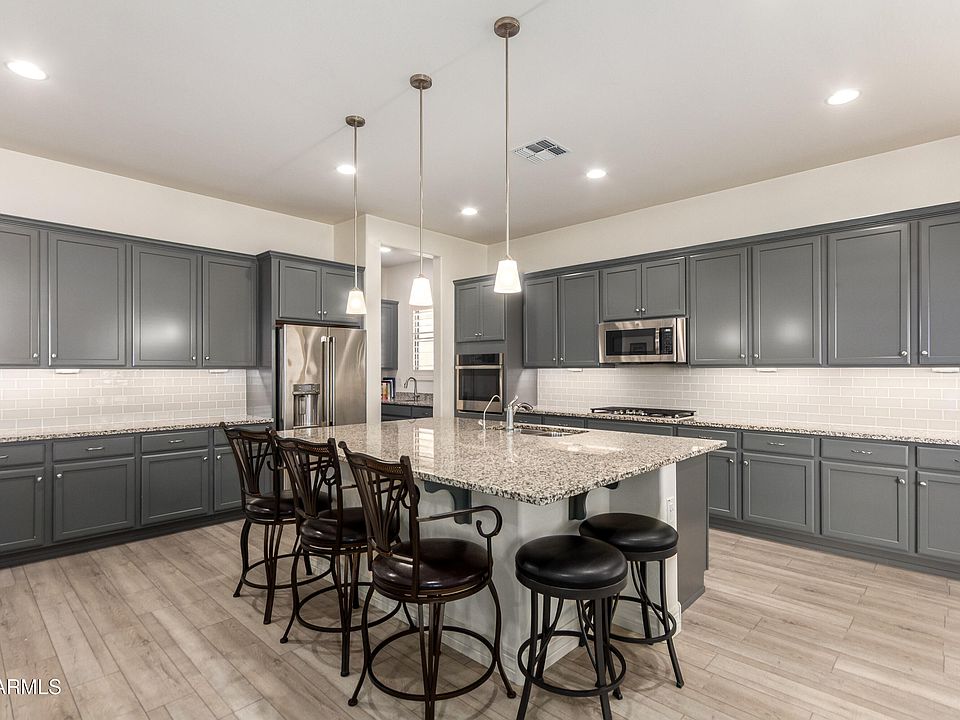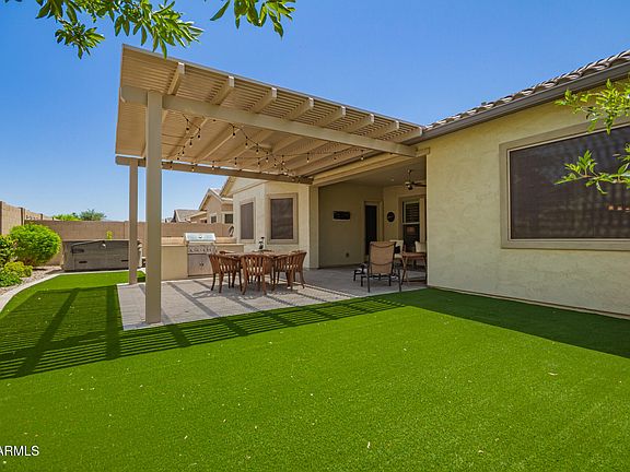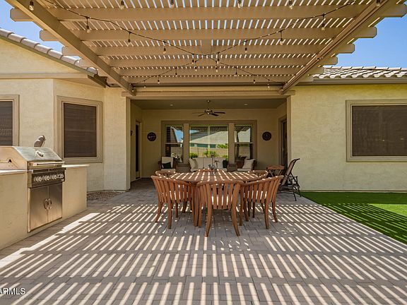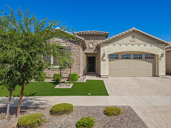 Lightly lived-in, highly upgraded Blissful Model in the heart of award-winning Eastmark. Bright, open layout with plantation shutters, recessed lighting & neutral tones. Chef's kitchen boasts a massive granite island, SS appliances, butler's pantry, soft-close drawers, tiled backsplash & under-cabinet lighting. Primary suite offers an extended bay window, walk-in closet & spa-style bath with dual vanities & rain shower. The entertainer's backyard features a built-in BBQ, pergola, bar, hot tub hookups, pavers, turf & covered patio. Extras include an extended 3-car garage, laundry room w/ sink, whole-house water filter & softener, R/O & sunscreens. Eastmark amenities: community center, trails, splash pads, skate park, lake, pool, parks, clubs & resident events.