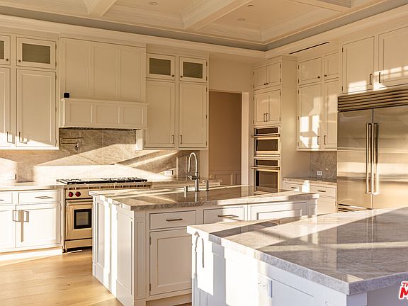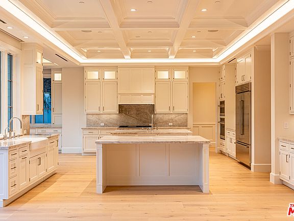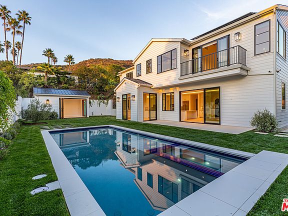 Privately set on a gated flag lot in Beverly Crest, this newly built Beverly Hills home blends timeless California Craftsman style with Cape Cod elegance. Elevated above the street for added seclusion, it features top-of-the-line finishes including hardwood floors, marble surfaces, designer lighting, custom millwork, and surround sound. The open floor plan includes a gourmet kitchen with dual islands, breakfast nook, and premium appliances, flowing into a spacious living area with large sliding doors that open to a private backyard with a pool, spa, lawn, and patio. A flexible office or guest room with fireplace sits near the entry, and a detached bonus space offers use as a gym, studio, or guest suite. Upstairs, the luxurious primary suite includes a fireplace, balcony with canyon views, spa-like bath, and walk-in closet. Located minutes from top-tier shopping, dining, and entertainment, this home offers luxury, privacy, and exceptional design in a coveted location.