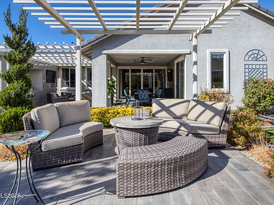 Former Gilmore Model Home - Over 550,000 in Designer Upgrades! This drop-dead gorgeous former model home in Regency at Caramella Ranch, one of Reno's premier 55+ Active Adult community, showcases approximately 550,000 in total upgrades, including a stunning custom waterfall by Gail Willey. Designed to impress, this home blends luxury, comfort, and effortless indoor/outdoor living. Upon entering, the custom flooring in the foyer sets the tone for this thoughtfully designed residence. The great room features elegant built-in cabinetry, a fireplace, surround sound, custom drapery, and sliders that flood the space with natural light while framing the breathtaking mountain views. The great room opens seamlessly to a covered patio, perfect for entertaining, complete with an outdoor kitchen, two indoor/outdoor TVs, heaters, a gazebo, and the tranquil waterfall feature—your own private retreat. The gourmet kitchen is a showstopper with floor-to-ceiling cabinetry, pull-out drawers, a custom backsplash, Miele dual-fuel steam range, farmhouse sink, wine refrigerator, built-in dining table that seats eight, and the refrigerator included with the home. The primary suite offers private patio access and features custom tile work, dual sinks, a walk-in shower with seamless glass doors, and a spacious walk-in closet with built-in organizers—a true owner's retreat. The second bedroom is located away from the main living area and primary suite for added privacy and includes built-in closet organizers, a striking faux brick accent wall, and pendant lighting. The hallway bath boasts luxurious tile and designer finishes. The secluded den offers a perfect space for a home office or reading area, highlighted by custom cabinetry and floating shelves with peaceful views of the front patio and waterfall. Additional highlights include: Control4 Home Automation System Electronic window shades Refrigerator, washer, and dryer included Garage with built-in cabinets, epoxy flooring, and a dedicated component room (all components stay) Garage door with backup battery Remote-controlled waterfall Mature landscaping for added privacy and beauty With approximately 1,690 sq. ft., this home offers 2 bedrooms, 2 bathrooms, a den, and a 2-car garage. The open-concept layout provides seamless flow between the kitchen, dining area, and great room, creating a bright and inviting atmosphere perfect for everyday living or entertaining guests. Located in the highly desirable Regency at Caramella Ranch, residents enjoy resort-style amenities, social events, and a low-maintenance lifestyle in one of South Reno's most sought-after 55+ communities. Experience the quality, craftsmanship, and attention to detail this exceptional home has to offer.