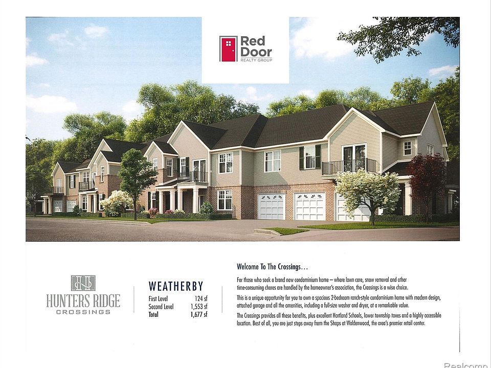 Beautiful New Condominium Under Construction in Hunter's Ridge in Hartland. Occupancy in 180+ Days. Spacious Upper Level Ranch. The Weatherby--Offers One-Floor Living with 2 Bedrooms, 2 Full Baths, Large Great Room, Dining Area, Open Kitchen with Snack Bar, Laundry Room and Attached 1-Car Garage with Storage Area. Kitchen Includes GE Range, Refrigerator, Dishwasher, Disposal and Microwave. Owner's Suite with Large Walk-In Closet and Large Private Bath. The 2 Bedrooms are Separated by the Living Area to Maximize Privacy. Sliding Door off of Great Room Leads to Balcony. Convenient Access to US-23 and Within Walking Distance to the Shops at Waldenwoods.