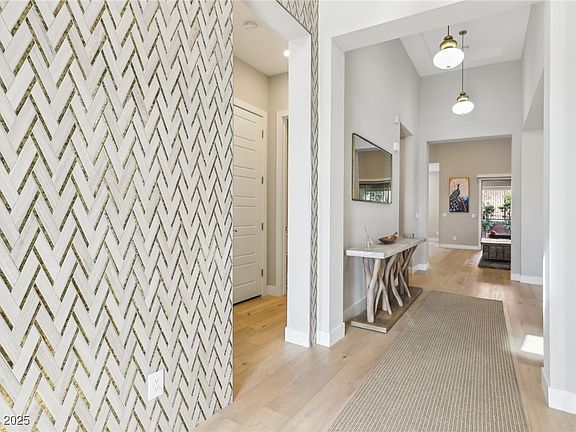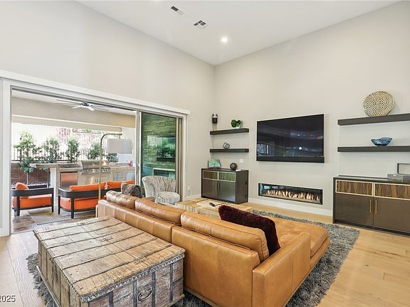 When you step into this luxurious Sundance model in the exclusive Regency at Summerlin , a premier 55+ guard-gated community, you will want to call it home. Note the unique chevron design tile wall upon entry and envision a life of vibrant style and functionality. The kitchen is a chef's dream with premium JennAir appliances, stacked cabinets, double ovens, pot filler and a spacious island that is great for entertaining. The expansive family room boasts voluminous ceilings and a stunning fireplace. The primary bedroom is a serene retreat with a spa-inspired bathroom with a rain head shower and multi-function handshower. The generously sized walk-in closet features custom shelving. Motorized blinds in the great room and primary suite. Relax in the tranquil backyard in the pool and spa or barbecue on the covered patio which features a fireplace and pizza oven. The garage has an epoxy floor and storage cabinets. Visit the clubhouse and check out the many amenities and activities.