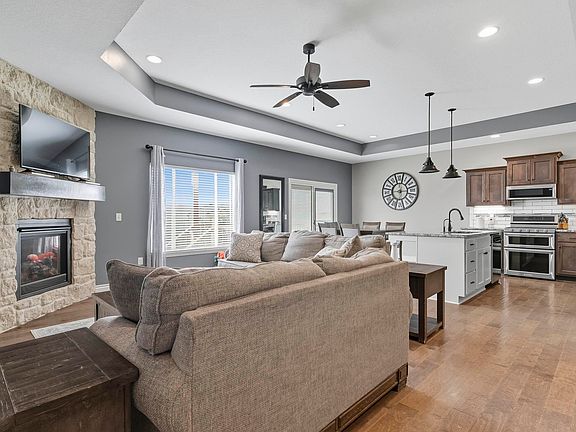 Don’t miss this immaculate 4-bedroom, 3-bath home in Whispering Meadows! Every detail has been carefully planned, from the open-concept living area with gas fireplace and wood flooring to the upgraded KitchenAid appliances with gas stove, granite countertops, island, and pantry. The spacious primary suite features a walk-in shower, dual vanity, and a large closet connected to the laundry room for added convenience. A second bedroom and full bathroom complete the main level. The finished basement offers a family room with wet bar, second fireplace, two bedrooms, and a full bath. Enjoy a fully fenced backyard, covered deck and patio, a sprinkler system and the insulated 3-car garage with insulated doors. HOA dues of $840/yr provide access to the community pool and playground. Located on Manhattan’s east side, this home delivers comfort, quality, and convenience—enhanced by the appeal of low special taxes.