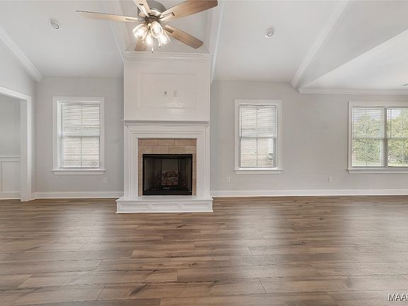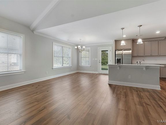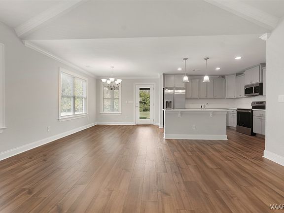Step inside the foyer with its classic trim work and feel right at home as you enter the great room featuring soaring vaulted, beamed ceilings, a cozy gas fireplace, and luxury vinyl plank flooring. The open-concept design flows seamlessly into the kitchen and dining areas — perfect for both daily living and entertaining. The kitchen boasts soft-close cabinetry, quartz countertops with matching backsplash, a breakfast bar, stainless steel appliances (refrigerator remains!), and custom pantry shelving.