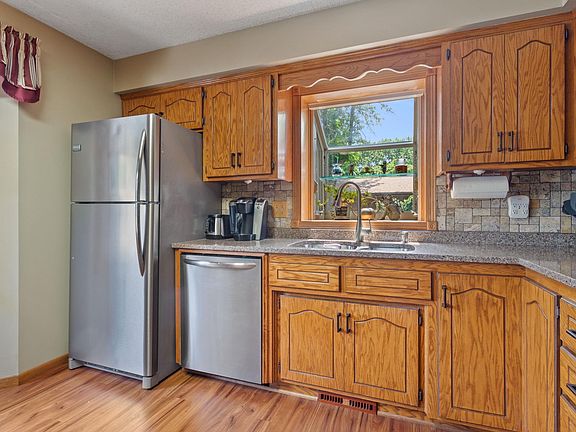 This 3-level split entry home shows pride of ownership from the original owner! The main level has newer vinyl plank flooring throughout, eat-in kitchen, dining room, and beautiful three season porch with vaulted ceilings and wooden walls. Off the porch is a large 18x16 Trex deck. The kitchen features a garden window, bay window, and stainless-steel appliances. You will find the open and airy living room with a bay window and two bedrooms on the upper level. The third level is finished with the family room, fireplace, and 3rd bedroom. Some newer features include: vinyl siding, concrete driveway, doors, and windows in 2007, furnace in 2012, new shingles in 2017, quartz countertops, vinyl plank flooring, central air in 2020, newer six panel doors, leaf guard gutters, irrigation system, and alarm system. There is a 2 story, 16x12 shed for storage and an amazing well cared for yard! Conveniently located close to freeway access, shopping, schools, and walking paths.