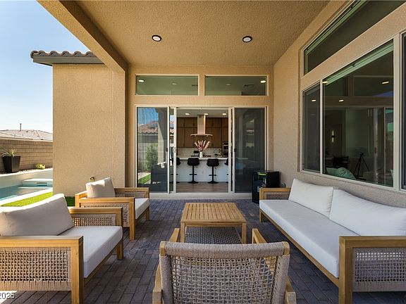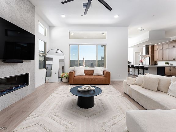 SELLER CONTRIBUTION TO RATE as low as 5.875%- SAVE $1000s! WELCOME HOME to this stunning ranch home with POOL located in Kyle Canyon, a premiere growing neighborhood in the Northwest. This home shows like a model! First the private courtyard provides an intimate gathering space and first impression. Next, the beautiful interior makes a statement with vaulted ceilings, large windows for natural light, floor-to-ceiling fireplace, and luxury vinyl plank flooring. The large gourmet kitchen features modern cabinets, island with cooktop and hood, and designer quartz countertops. The generous floorplan provides a master bedroom suite separate from the secondary bedrooms in their own wing, plus a den/office flexible space. All bathrooms are beautifully appointed. The best is yet to come with the tranquil backyard with covered outdoor living, modern pool and spa, and grass area, with a backdrop of mountain views. All this, plus Smart Home features and an EV charger for daily convenience!